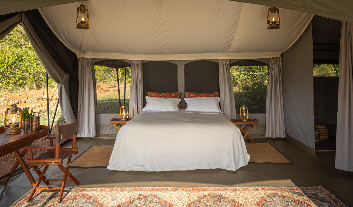There are eight tents in total, all placed around the rim of the conservancy’s Saddle Valley to allow for privacy and views of the savannah. There are seven simple, comfortable safari tents (twin or double), each with a private deck overlooking the plains, and a Family Tent, with two en‑suite bedrooms connected by a shared deck—ideal for families wanting space without losing the classic safari feel. Children of all ages are welcome here – although we’d say it was best for older kids, and the camp offers the Young Explorers Club, where Maasai guides teach tracking, bushcraft and wildlife skills in a gentle, engaging way. Families who enjoy nature and don’t need resort‑style facilities love it.