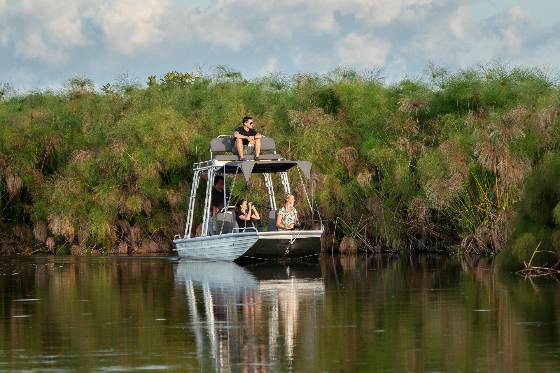 Like most of the best safari camps, Magashi is small, with just six tents in the forest along the shores of Lake Rwanyakazinga. They’re decorated in modern African style. It’s rustic, almost raw feeling, but very comfortable, with bare wood, lots of Rwanda’s famous baskets and a mozzie net over the bed. There’s also Wi-Fi in the tents for sending the odd message (and by message we mean shamelessly envy-inducing photos) home. Air-conditioning would require being too sealed off from the nature you’ve come to see, so Magashi’s tents all have fans for the occasional hot day. Serenades are provided by the hippos and you can expect to hear the scamper of the odd cheeky monkey. When you leave your tent, you follow a boardwalk back to the horseshoe-shaped main area of camp. Here there’s the bar, dining area, and deck, which still has the ancient trees growing through it. Down below is a small pool and a fire pit for early-evening star gazing.