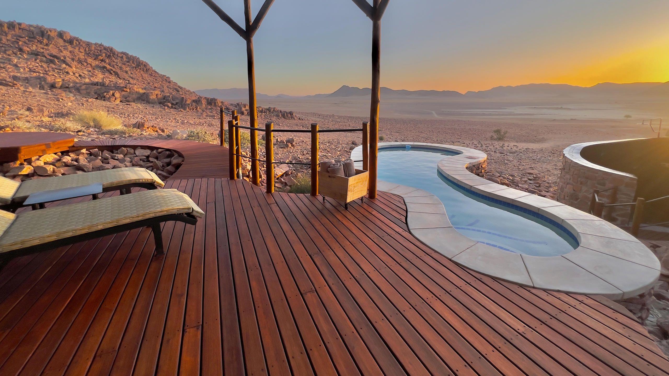 Spaced out from the main lodge, but with the same glorious vista are the 12 tented rooms, with floor to ceiling windows, a deck to perch on with a book, and behind, your ensuite bathroom including a loo with a serious view. There’s a thatched roof up above to keep off the worst of the baking sun, and inside, the décor is a pleasing mix of muted colours, natural material, and modern colonial style. Up above the bathroom is a small terrace- if you’d like to sleep up here under the stars, please let the staff know and wrap up warm- we’ve never seen stars to match those of the Namib, but desert nights can be seriously chilly! In addition to the standard chalets there is one superior chalet which comes with a private lounge and a plunge pool.