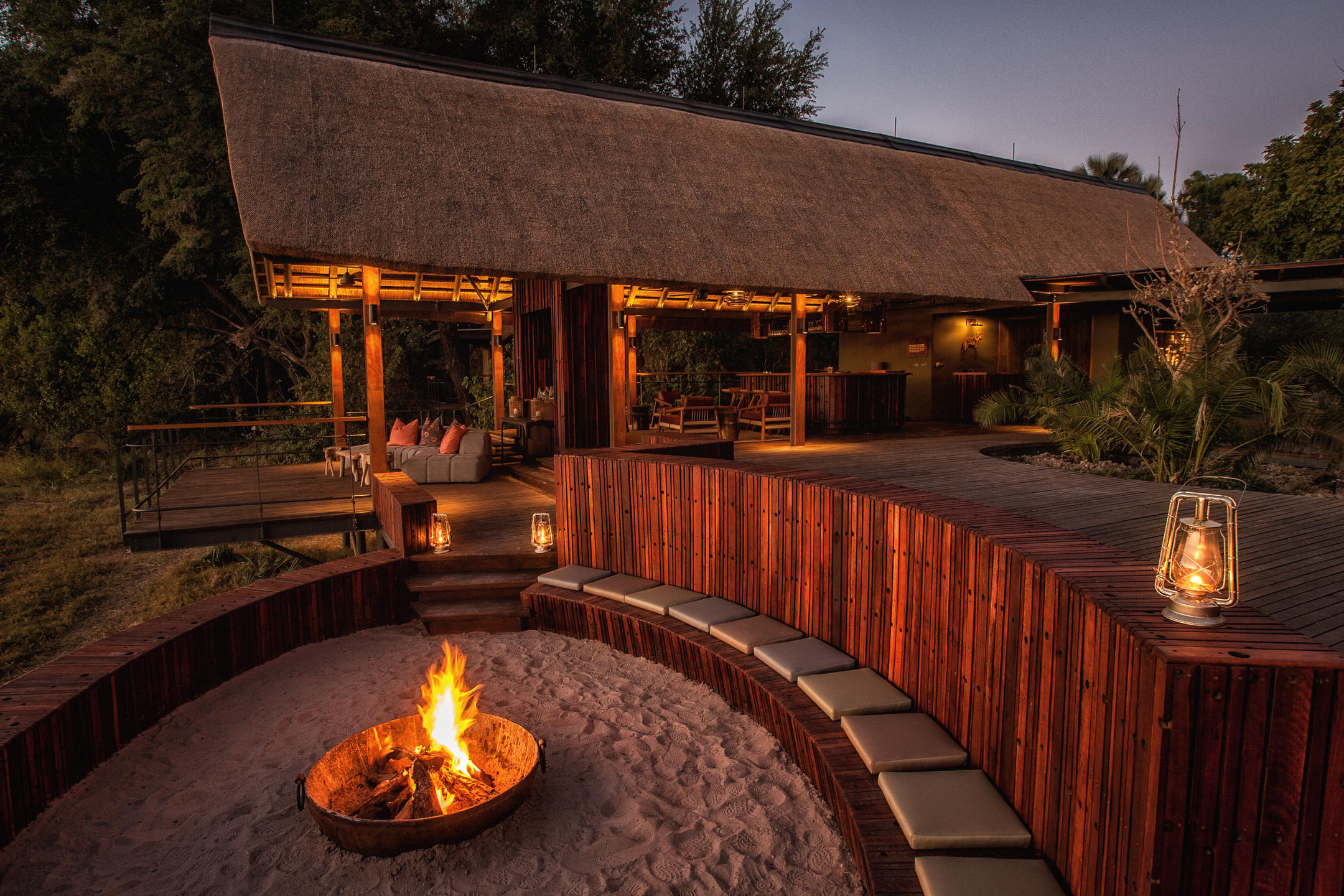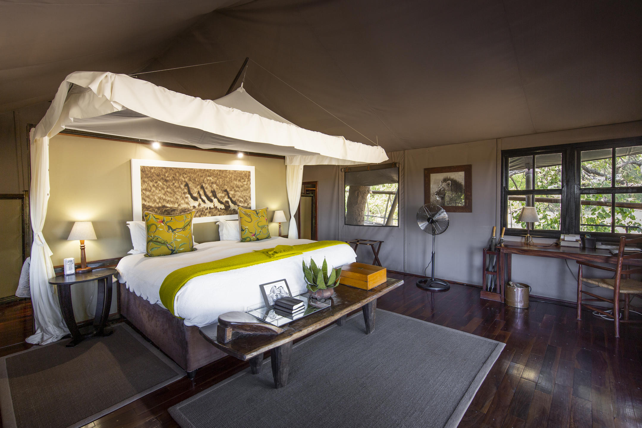 Staying at Chitabe you are seriously deep in the bush. Your morning coffee’s tucked away in a baboon-proof box, ground squirrels scamper along the walkways and kudus browse the branches down below. The feel’s very much of a cosy bush camp. At Chitabe meals are wholesome and communal, sharing safari tales each evening over flickering lantern light, and guests stay in large, comfortable canvas safari tents with a bathroom tucked away at the back and an outdoor shower looking out towards the floodplain. Back in the main area there’s a pool (an absolute godsend in the baking heat of summer), a loo with a serious view and a small library where you can hideaway if you want a few hours of peace and quiet. Lastly, if you have eaten too much delicious safari food, Chitabe also has a small gym.