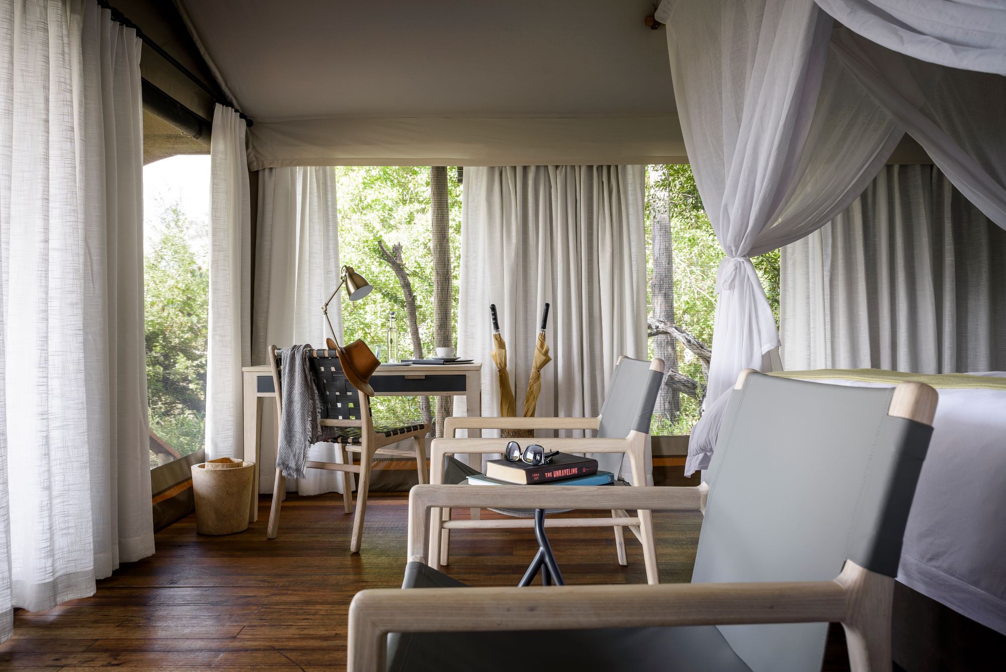 The main area of camp is beautiful- a light and airy canvas bower looking out over the floodplains. Here you’ll find a large sitting room, a bar for evening drinks and canapes, and a dining room. Meals were wholesome, good and shared with the other guests on our game drive vehicle. Just try to ignore the patter of feet on the roof- those’re the monkeys hoping to sneak in for a quick nibble. There’s also a rather lovely swimming pool and a fascinating family of mongoose that provide endless entertainment for guests. From the main mess, sandy pathways lead to the eight safari tents- after dark you’ll be escorted in case of any unexpected animal encounters. There are ten light and airy modern rooms, with an ensuite bathroom tucked behind and a view towards the floodplains beyond.
