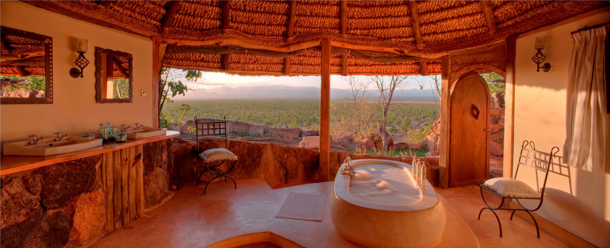From here, rocky paths lead to the six cottages, built of gnarled wood, with polished stone floors and high thatched roofs, and barely a straight line in sight. The feel is rustic, but extremely comfortable, and each room has a small private sitting area- either a sitting room or a private deck. There are also three honeymoon suites- two with outdoor baths and one with a large open sitting room. Tucked on the other side of the kopje from the main lodge is Elsa’s Private House- a double and a twin room either side of a large sitting room and dining area and a private pool. The double room has an ensuite bathroom with outdoor shower, the twin room has an ensuite shower room. Lastly the family cottage also has two ensuite bedrooms and a private sitting/dining area, but does not have a private pool.