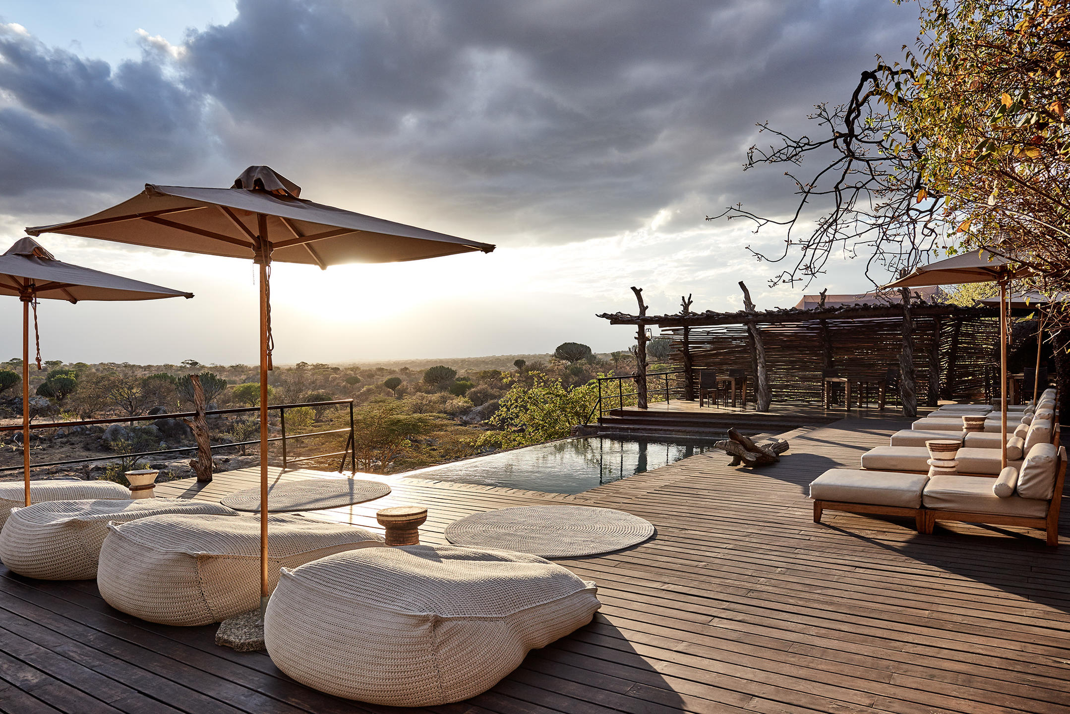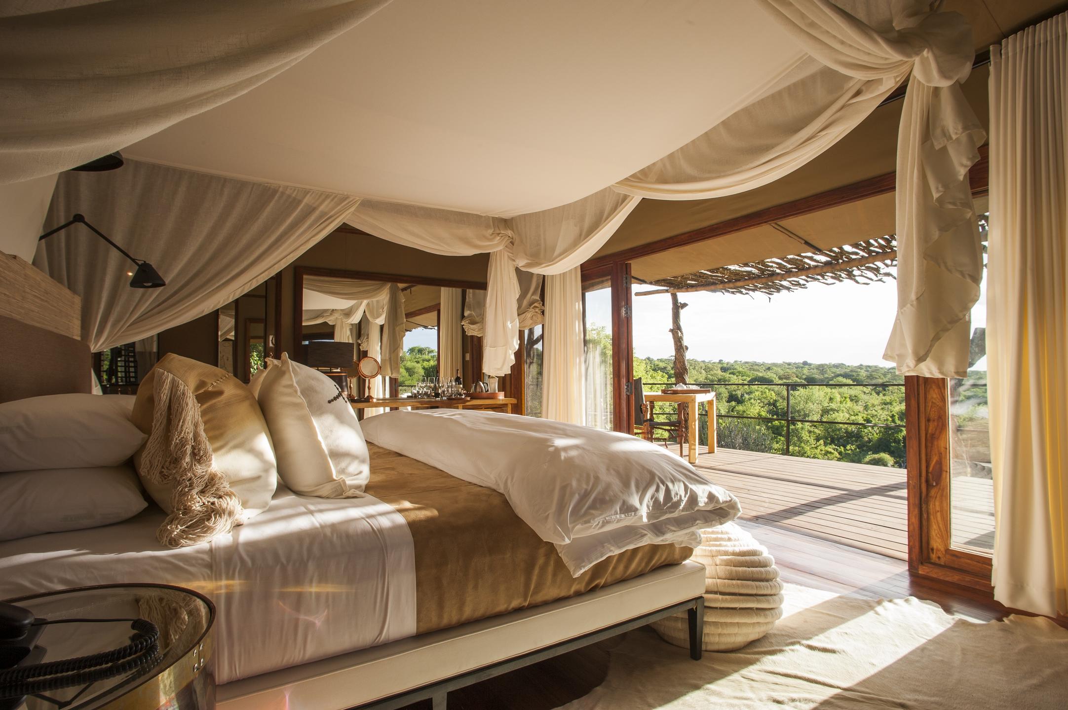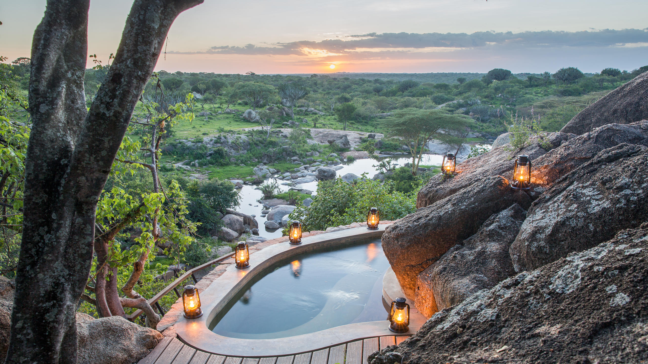 Arriving at Mwiba, wooden walkways lead you through the boulders to the cosy lounge and bar area. This flows out onto the main deck where you can look out over the bush. Meals are often served here, or outside in the boma or in the lodge’s library. Below is a swimming pool, and nestled further away in the rocks is the spa and gym.