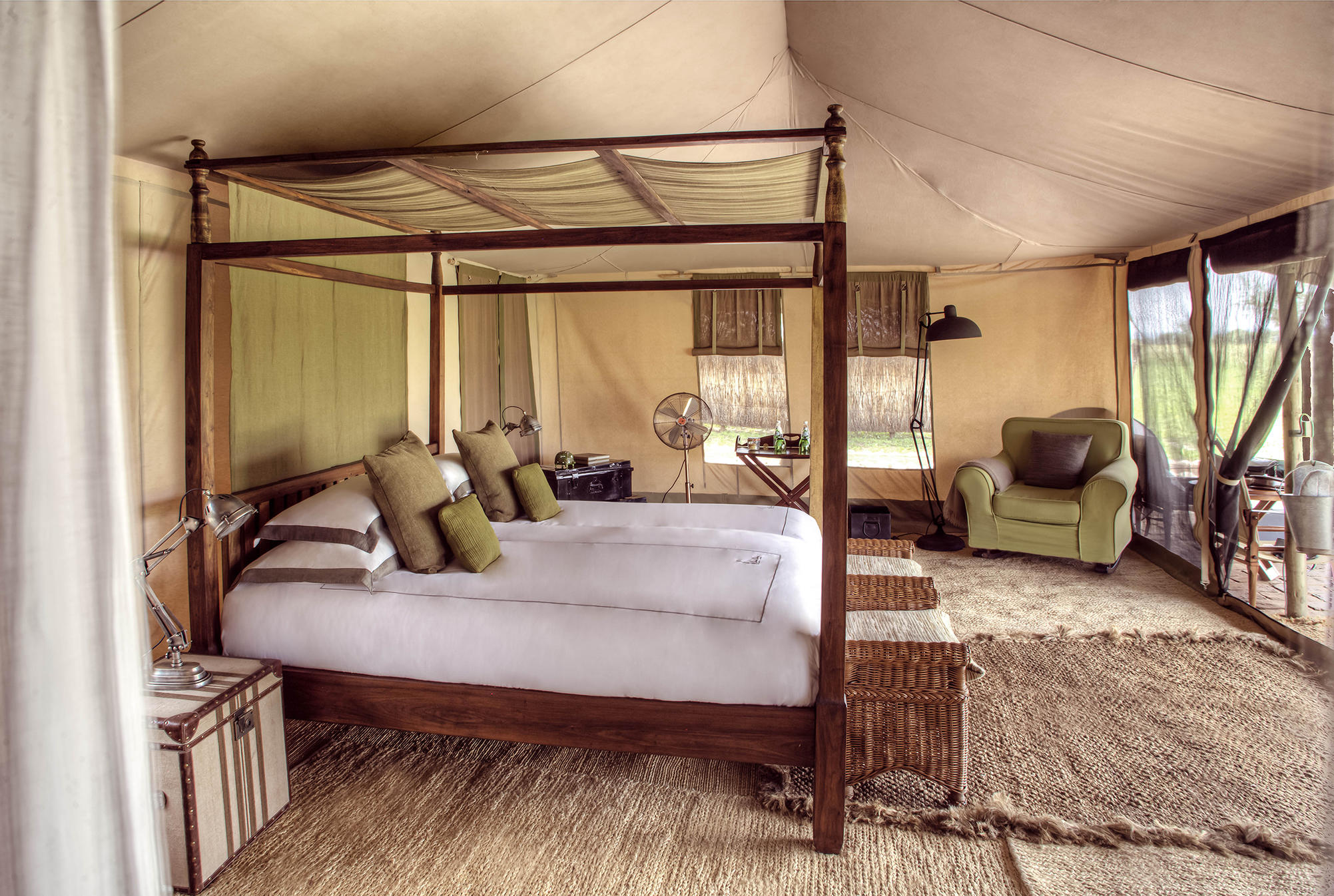 The camp certainly does its best to get guests to stay for as long as possible, with sweet welcoming staff, lovely food, and an atmosphere that makes guests feel utterly at home. The six tents are cosy and comfortable with a peaceful natural feel to them. They’re decorated in shades of stone and pale green, and have double or twin four poster beds. Tents have fans, not air-conditioning. The idea is to feel your connection with the bush: hence the telescope on the desk for spotting distant wildlife and outdoor showers for washing under the stars. One of the tents is a family tent which has two bedrooms, one double and one twin, each with their own bathroom.