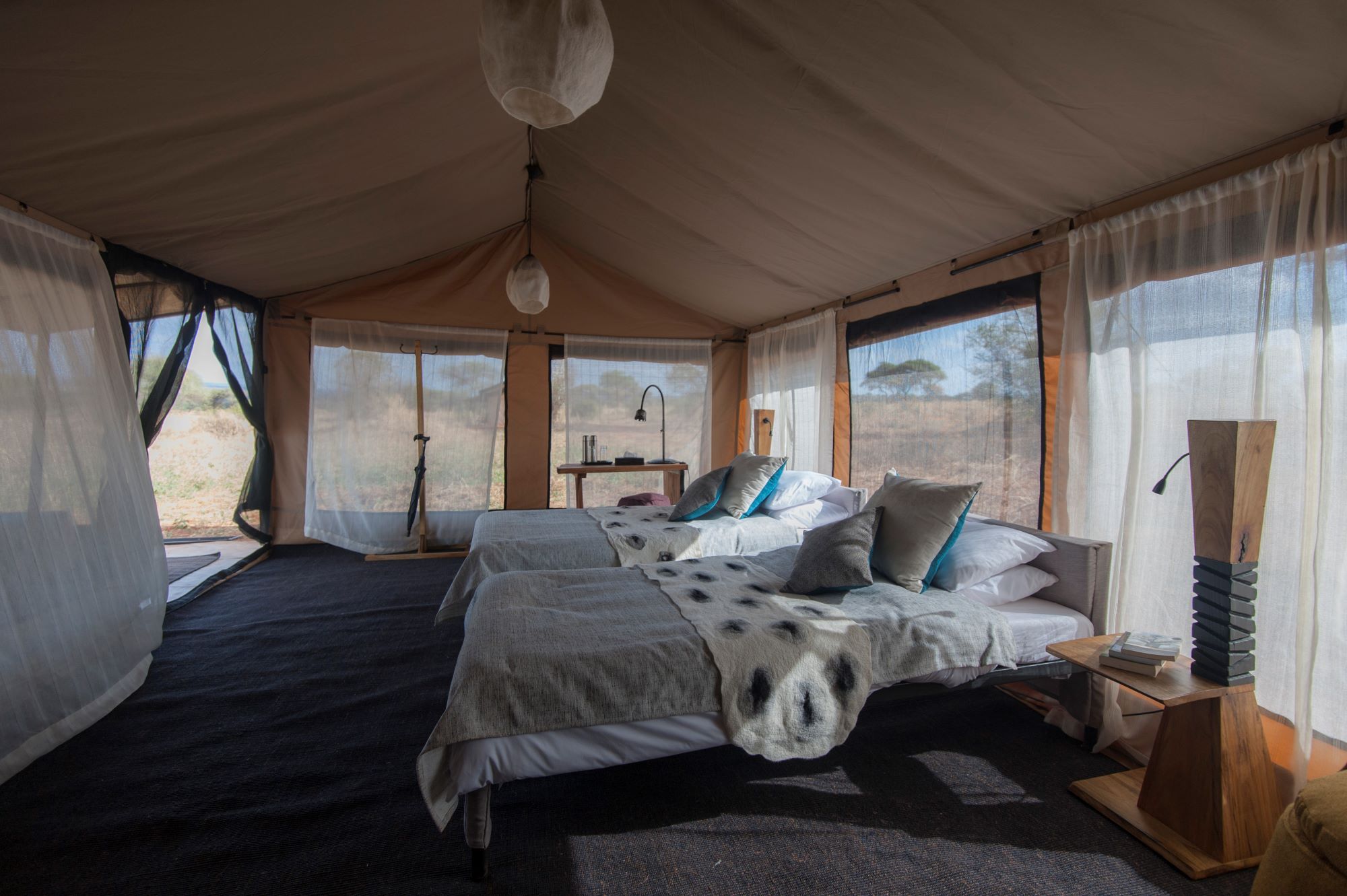The main mess area is made up of two large tents- one a cosy a sitting area, where you can curl up with an afternoon book or an evening drink, another a dining room serving fresh food in both local and international style. Outside is the fire pit, and from here, pathways lead through the dust and acacia thorns to the nine luxury safari tents. These are made of sand-coloured canvas, and can be set up as double, triple, or twin rooms. Inside, the tents have a comfortable bed, and an ensuite bathroom with flushing loos and traditional bucket showers. The feel is firmly Tanzanian, but modern and colourful, with plenty of character. The staff here are particularly worth mentioning- warm, kind and full of thoughtful touches, like morning coffee served on your verandah. In all, this is a charming, atmospheric option in an excellent game viewing area, and we would heartily recommend this for guests wanting an authentic tented camp inside the park, without the higher costs incurred elsewhere.