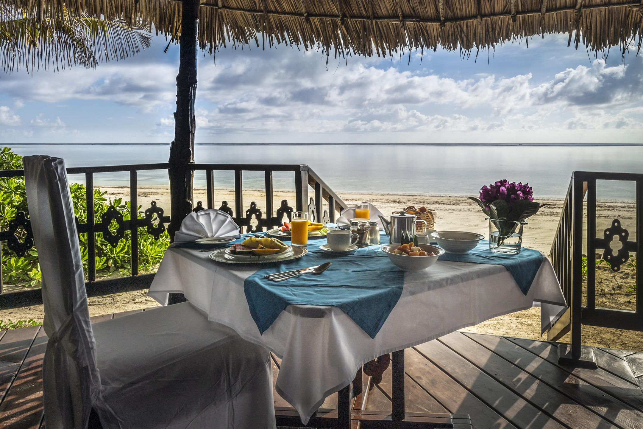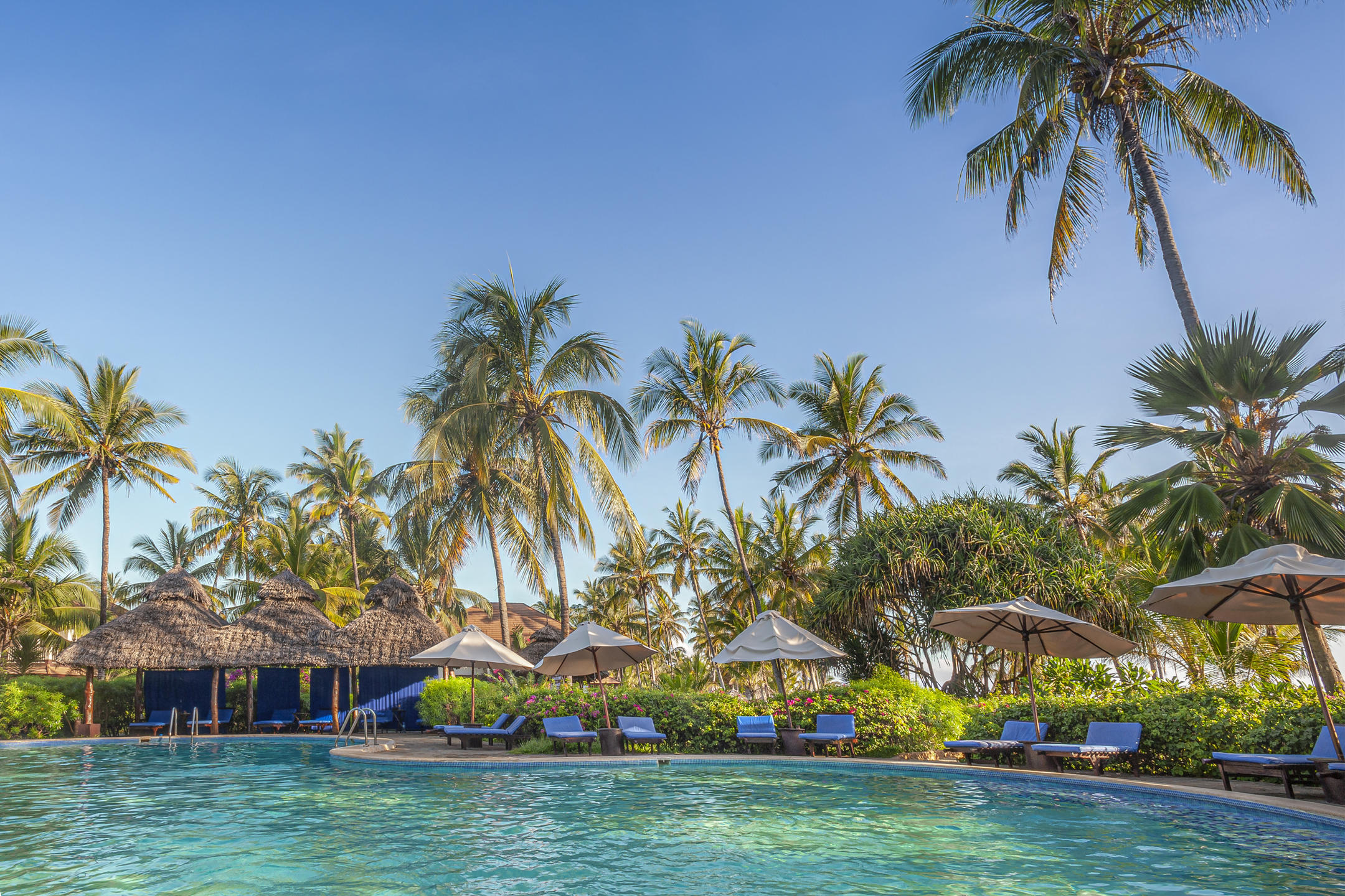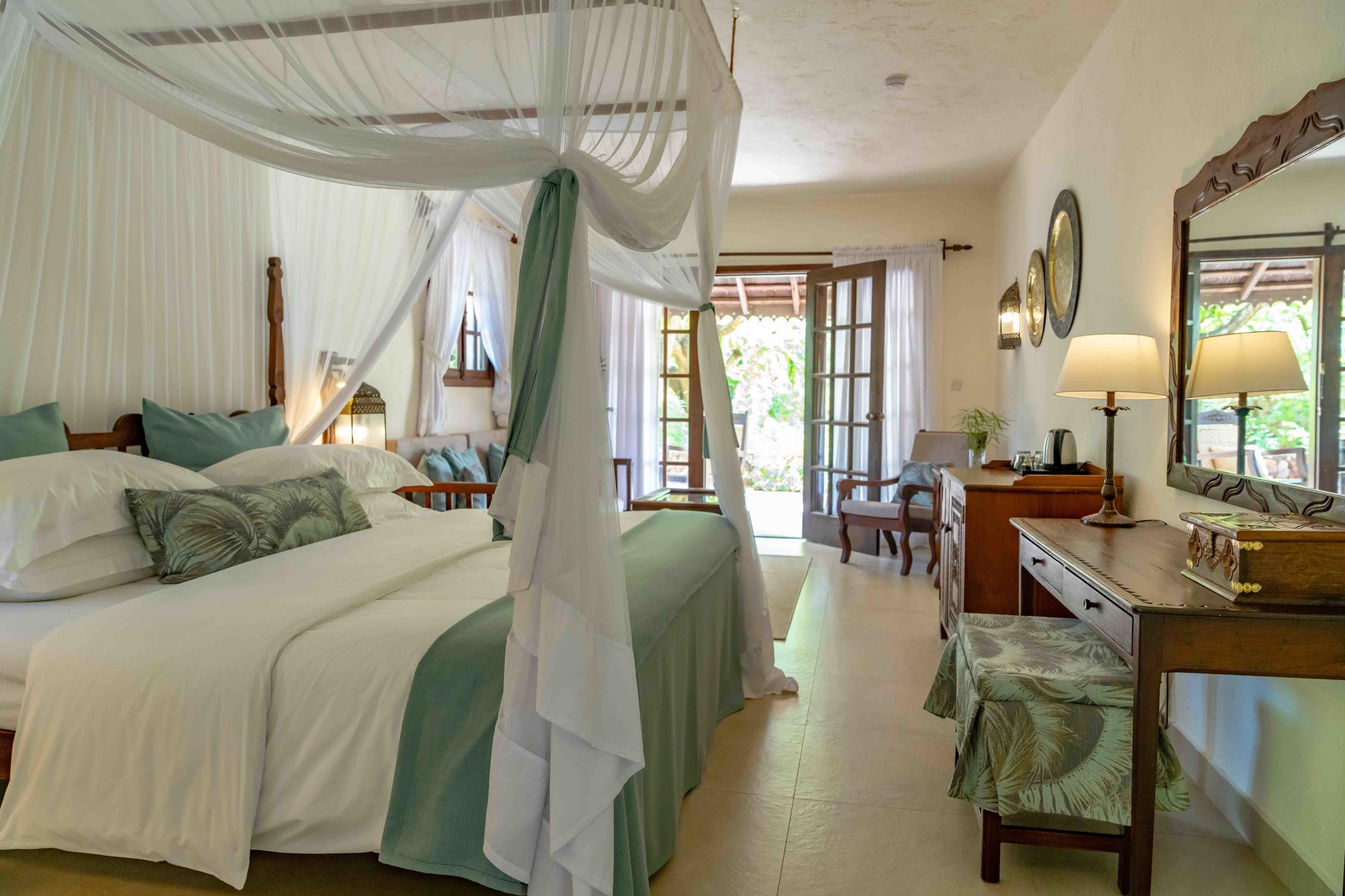 Rooms are split amongst tiled, Mediterranean-style villas, with deluxe rooms downstairs, and the slightly larger suites upstairs. At the back of the plot are the standard rooms, very similar in style and size to the deluxe rooms, just a little further from the sea. Inside the rooms, you’ll find the blissful cool of air-conditioning, and dĂ©cor that firmly reflects Zanzibar’s Omani heritage, with sweeping drapes, carved wood and the odd glitter of metallic fabric.