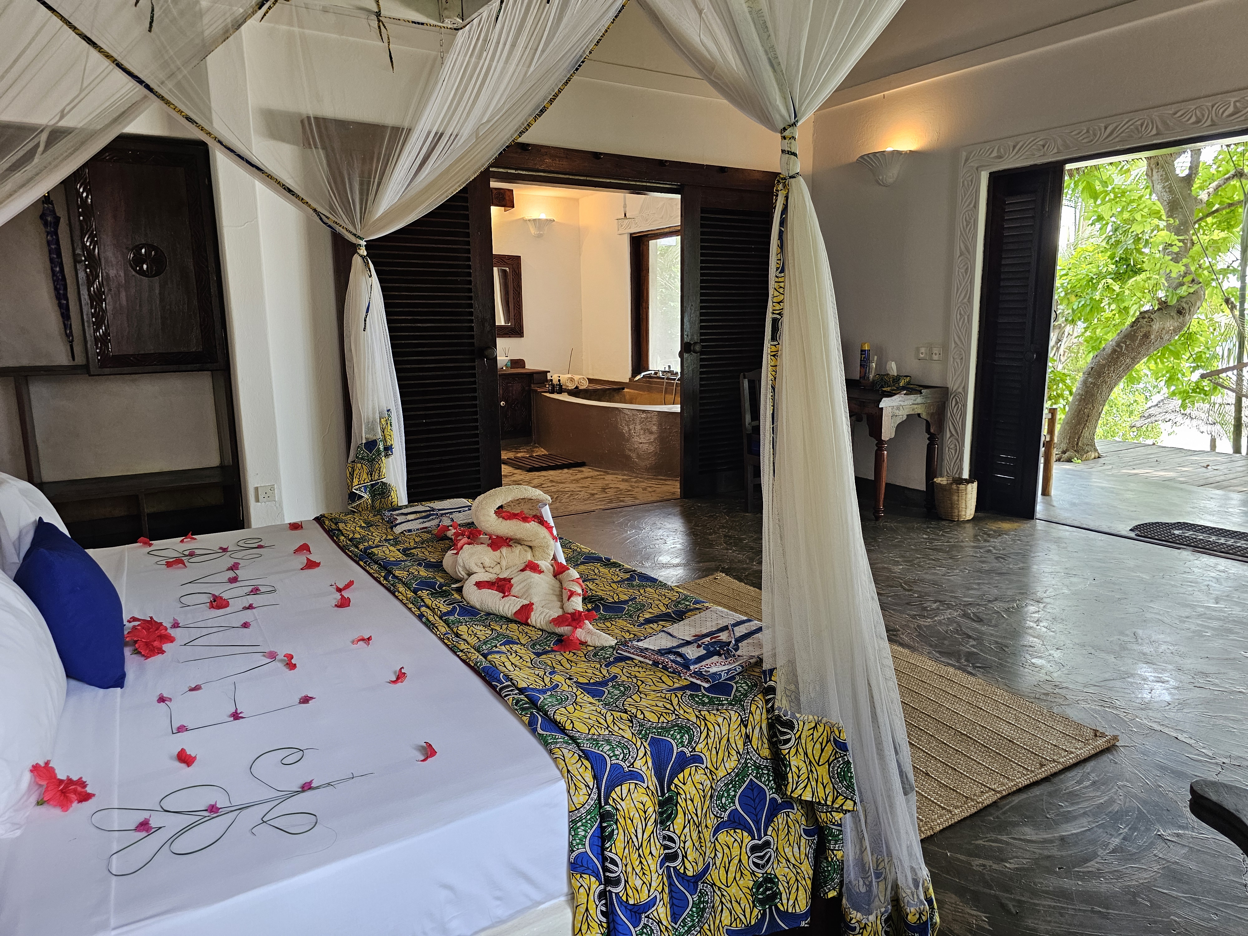 In front of the rooms, you’ll find a small stretch of beach with sun loungers and shade provided by the palm trees and umbrellas. The main areas include a breezy restaurant and bar serving simple, tasty food, a swimming pool tucked among the gardens, a small spa and a watersports centre (for days when you feel like swapping serenity for salt spray) with PADI diving, Dhow trips and kayak rentals on offer. You’re also only half an hour from Stone Town should you wish to explore…