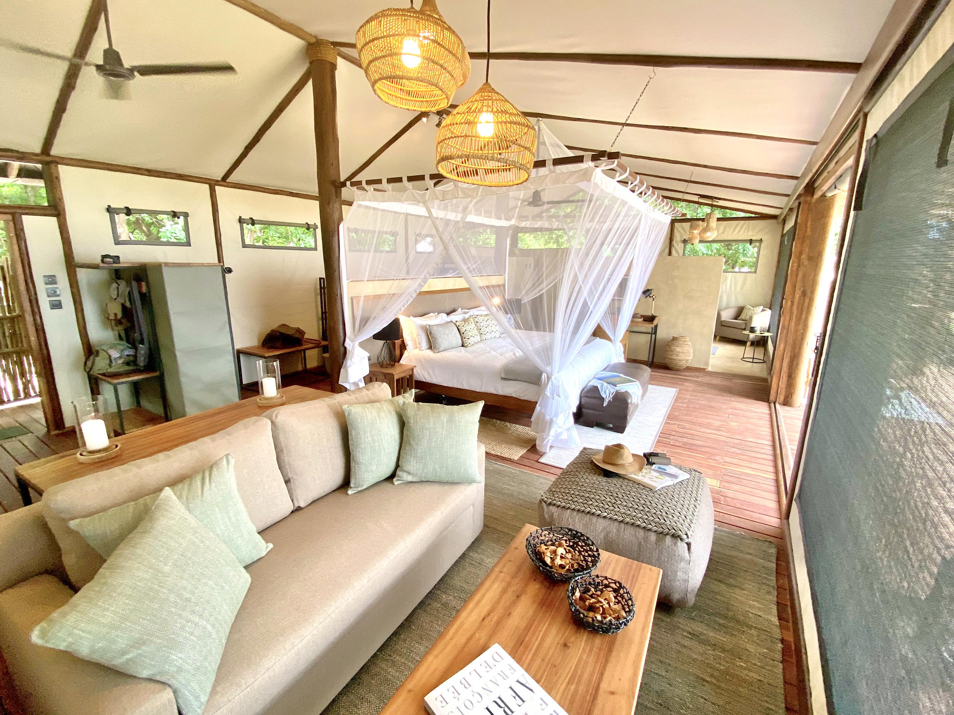 Following sandy pathways along the river you will find 9 elegant, rustic tents each perched up on decks. They have king-sized or twin beds, wi-fi, ensuite bathrooms with indoor and outdoor showers, roll top baths, and a verandah in case you’re in need of a gentle afternoon snooze. Rooms closest to the main area look out over the river, and the further flung, more private rooms sit sideways on to the Zambezi looking out over a dry river bed- a convenient soft and open path for animals walking down to the water. Right at the far end is the safari suite- with its own private pool and sitting room, which doubles as a second bedroom if you are travelling on a family safari.