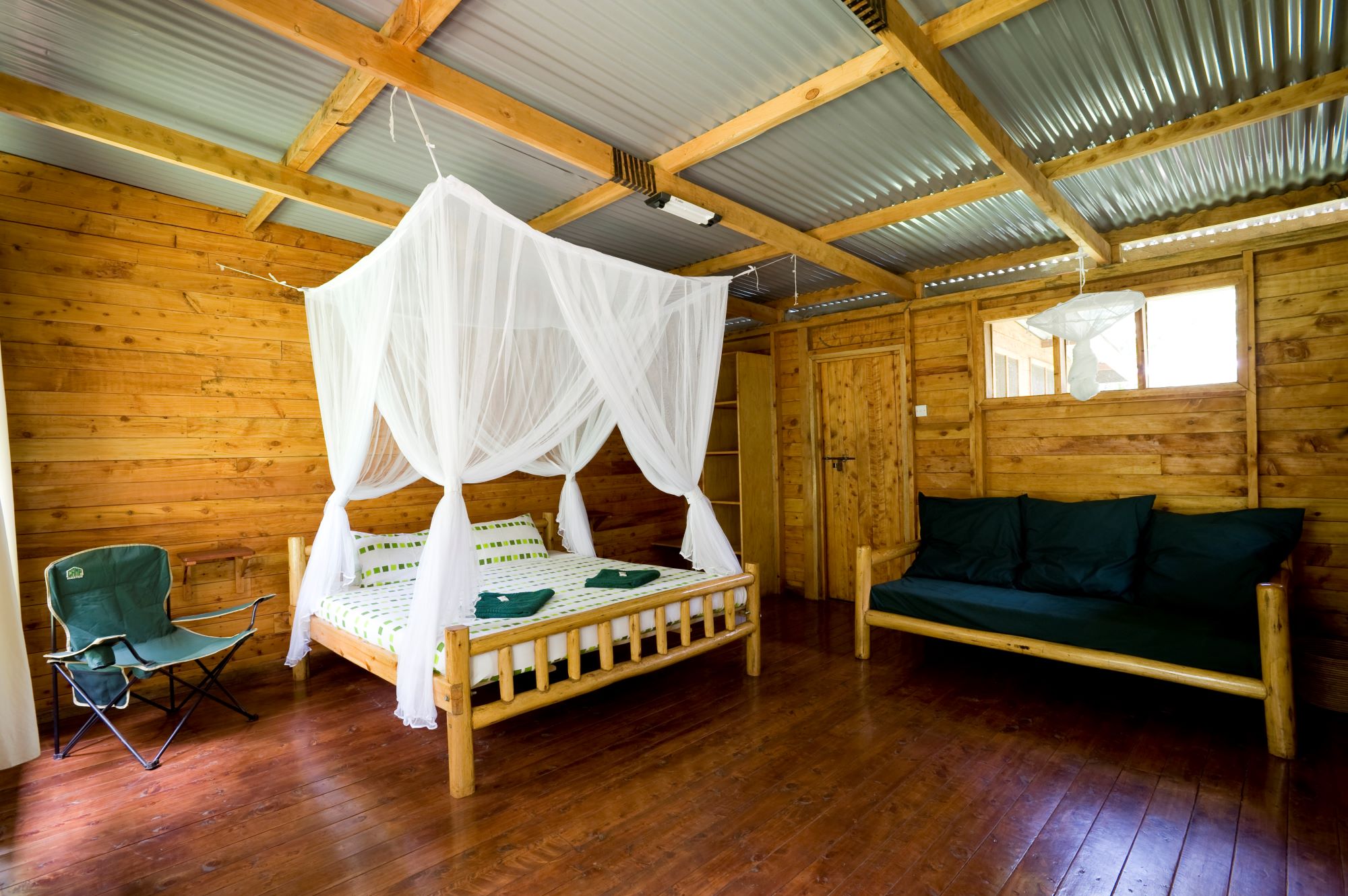 Budongo Eco Lodge is right in the forest with a small clearing where the main building is. This serves as your bar, a basic restaurant and the base for meeting before chimp treks. There is then a dormitory (we don’t generally use this for Extraordinary Africa guests) and three cabins, each split into two bedrooms. We would stress that the cabins are simple with tin roofs, and wooden walls and floors so the overall effect is fairly chalet-like. Inside, the rooms are basic, but functional. There are double, twin or double + single beds, with mosquito nets, and a sofa. The bathrooms have showers with solar hot water and eco loos with ash. Budongo is firmly on the simple end of the spectrum, but for guests who come with the right expectations, it is a convenient base for the chimp trekking, and falling asleep with the noises of the forest all around is enchanting.