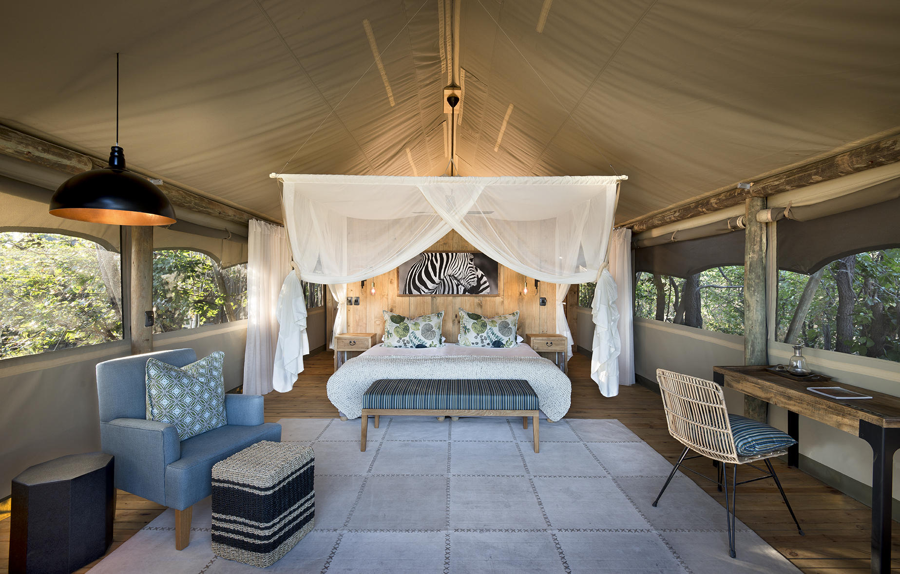 The camp is really beautifully designed, set at the edge of the riverine forest looking out onto a lagoon full of spluttering hippos and passing animals in need of a drink. Sable Alley’s main area is a thatched, open-sided building looking out over the water and grasses. Inside the roofs are high to let the breeze flow through and there’s very natural décor with wood, rattan and gentle muted colours. Decking is laid out with plenty of seating to make the most of the view, and there’s a firepit for evening chats around the bush TV. There’s also a small, but perfectly formed pool, which is one of the things that makes this a great choice for families with older kids- and an absolute blessing in the searing heat of October and November.