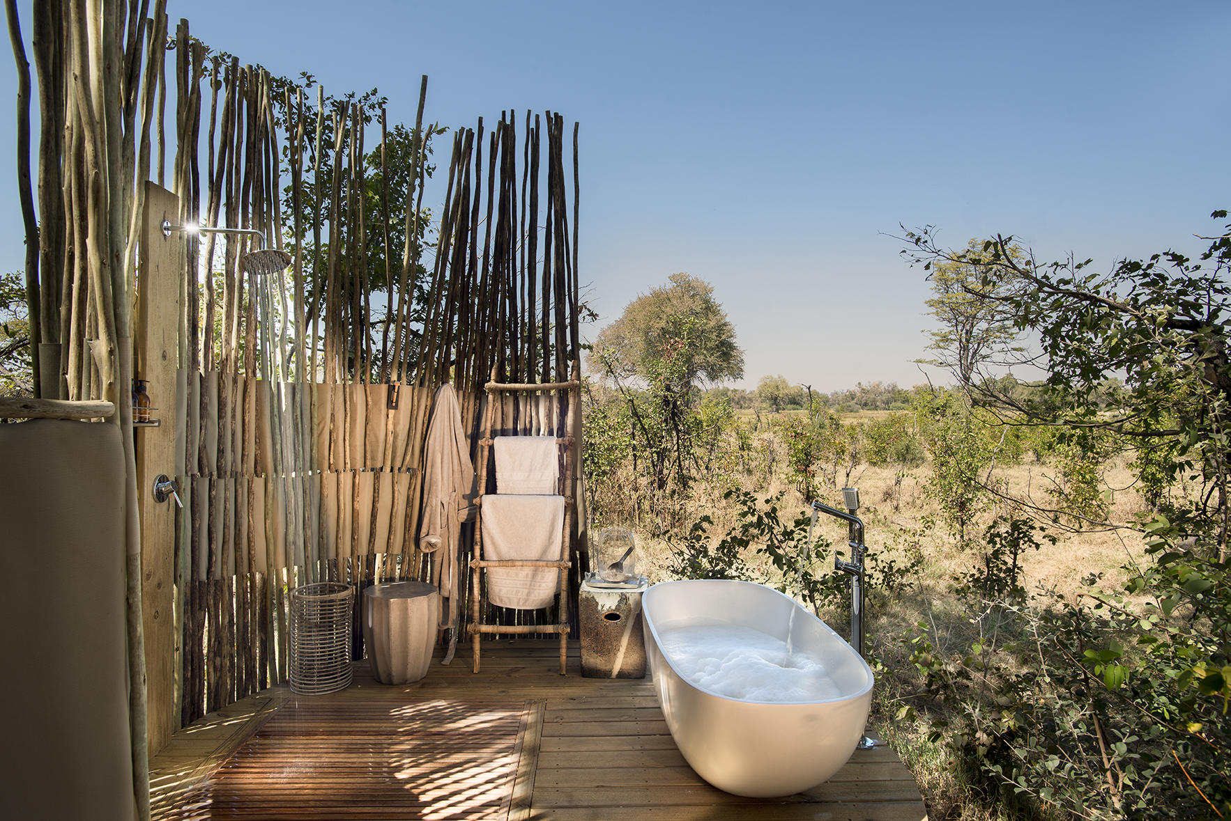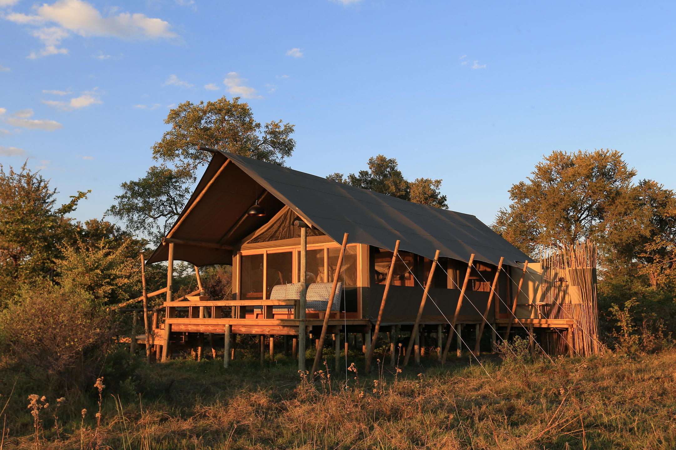 Set on the edge of the forest and the floodplain are nine lovely “standard” tents, a family tent and a honeymoon tent. They’re raised up on stilts so they sit strong when the floodwaters flow in. There’s a small deck and sitting area at the front, a bedroom, and behind a bathroom with flushing loo and both indoor and outdoor showers. If you haven’t tried the latter before, please do, it’s magical – even when it’s a really chilly July day. The family tent has two rooms that connect together via an enclosed walkway, and the honeymoon tent is set quite far away from the main area for maximum privacy and has a lovely outdoor bath. In all, while we’d say this probably isn’t absolutely the fanciest camp in Botswana, it’s certainly very comfortable and is an absolute delight for